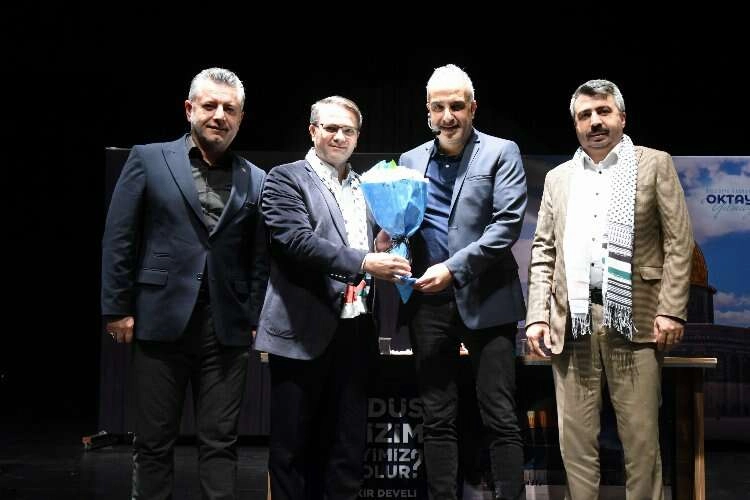 Söyleşinin ardından sahneye çıkan Yıldırım Belediye Başkanı Oktay Yılmaz, “Kudüs, insanlığın merkezi, bizim gönül coğrafyamızın incisidir. Müslümanların kutsal mabedidir. 75 yıldır İsrail zulmü karşısında sadece ve sadece yüreklerindeki imanın gücüyle mücadele eden, insanlığın ve Müslümanların haysiyetini koruma görevini üstlenen Filistinli kardeşlerime şükranlarımı sunuyorum. İnançlarını ve vatanlarını savunurken şehit düşen kardeşlerimize Rabbimden rahmet diliyor ve bu mücadelede yaralanan gazilerimize acil şifalar diliyorum. Terörle mücadele operasyonlarının devam ettiği bölgelerden ne yazık ki acı haberler aldık. Vatanımızın bölünmez bütünlüğü, milletimizin huzuru ve güvenliği için gözünü kırpmadan şehitlik mertebesine yürüyen tüm kahramanlarımızı rahmet ve minnetle anıyorum. Bekir Develi’ye bu samimi sohbeti ve anlattıkları için bir kez daha teşekkür ediyoruz. En kısa zamanda Özgür Aksa’da buluşmak duasıyla” diye konuştu.