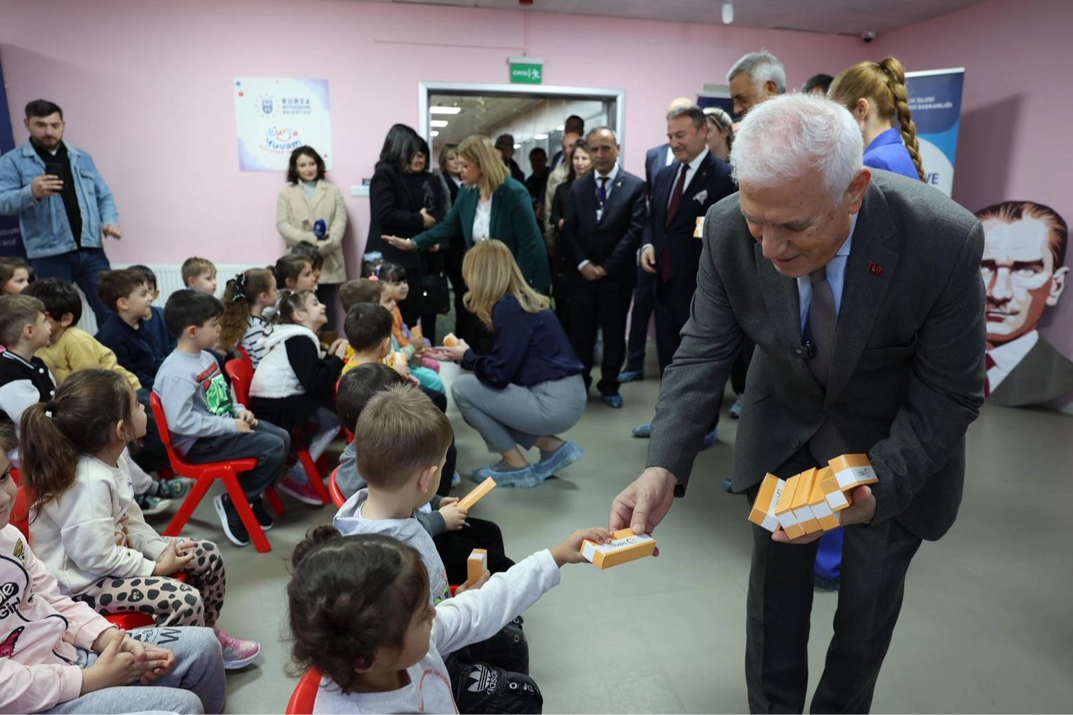 Bursa Büyükşehir Belediye Başkanı Mustafa Bozbey ve eşi Seden Bozbey de Gürsu’daki Kurtuluş Bursa Yuvam Çocuk Etkinlik Merkezi’ni ziyaret ederek çocuklarla buluştu. Başkan Mustafa Bozbey, çocuklarla birlikte uzman hekimlerden doğru fırçalama tekniklerini dinleyerek, etkinlik sonunda miniklere diş fırçası ve diş macunu hediye etti.