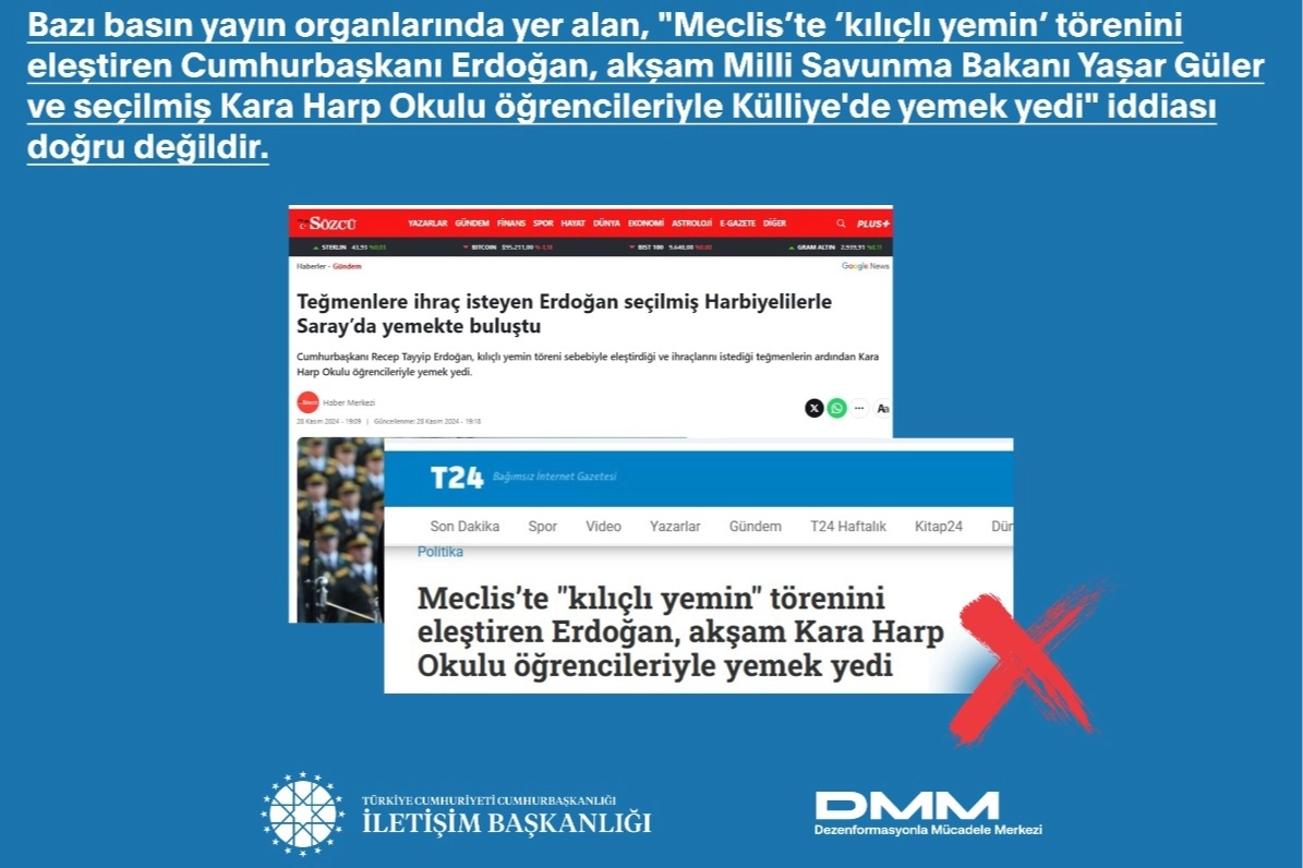 Dezenformasyonla Mücadele Merkezi'nden yapılan Cumhurbaşkanı Erdoğan’ın seçilmiş Kara Harp Okulu Öğrencileri ile yemek yediği iddiasına yönelik açıklamada, Cumhurbaşkanı Recep Tayyip Erdoğan ile Millî Savunma Bakanı Yaşar Güler, bahse konu tarihlerde iddia edildiği gibi bir yemeğe katılmamıştır. Cumhurbaşkanı Erdoğan’ın 27 Kasım programında yer almayan bir yemekle ilgili iddiaların asılsız olduğunun altı çizildi.