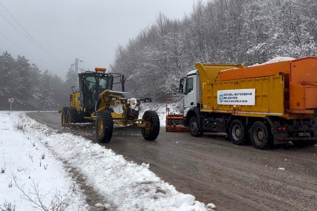 Kocaeli Büyükşehir Belediyesi Karla Mücadele Ekipleri, kar yağışının sürdüğü yüksek kesimlerde küreme ve tuzlama çalışmalarına aralıksız devam ediyor