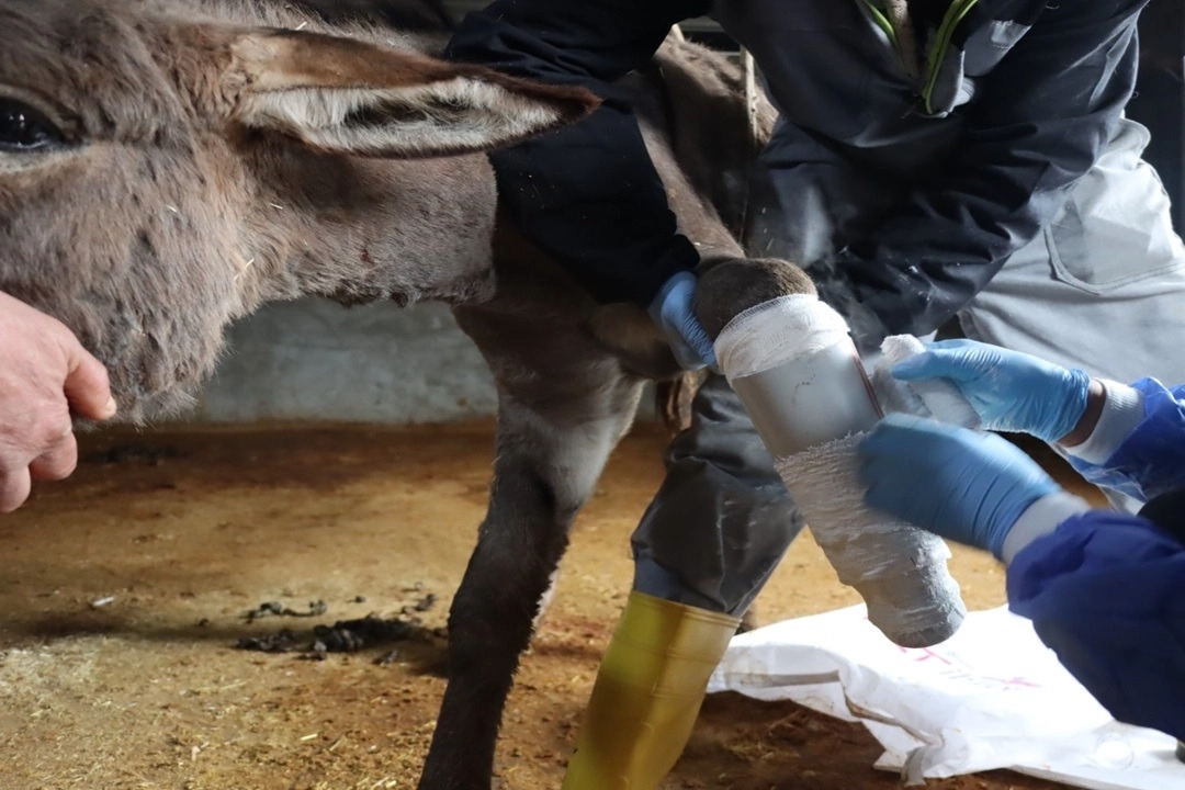 Ekipler, eşeğin sol ön ayağında ciddi bir kırık tespit etti ve hemen müdahaleye geçerek, hayvanı rehabilitasyon merkezine getirdi. Yapılan başarılı bir cerrahi müdahale sonucu, eşeğin kırık olan ayağı ampute edilerek yerine, özel olarak tasarlanmış bir protez takıldı.