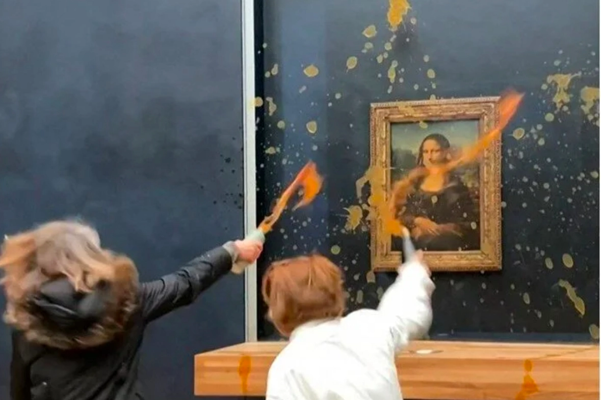 İki aktivist, "Tarım sistemimiz hasta" diyerek ve "sağlıklı ve sürdürülebilir gıda" talep ederek Mona Lisa tablosuna çorba fırlattı.