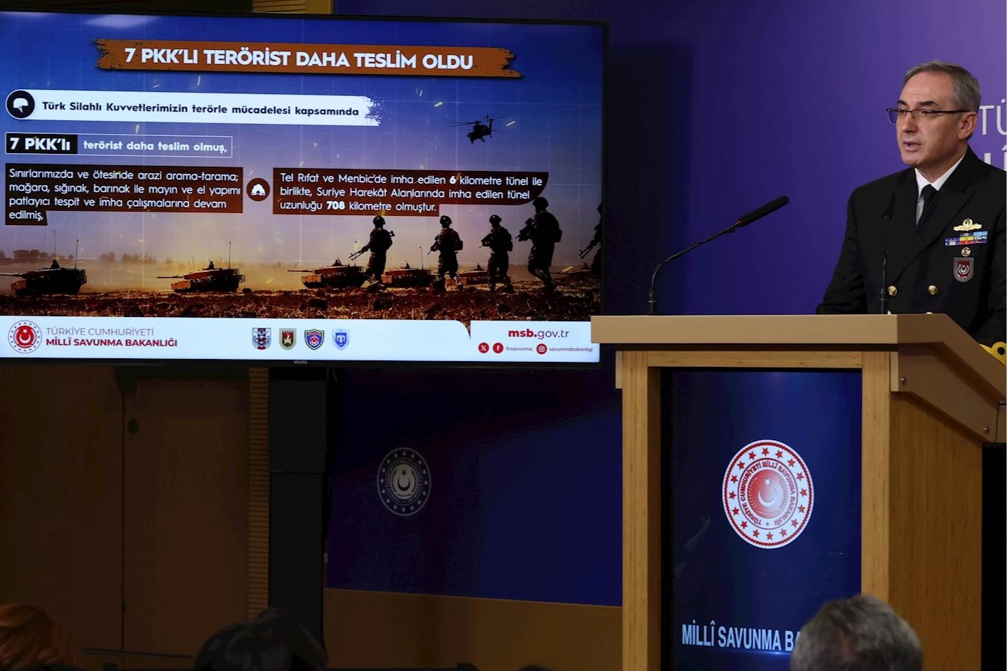 Bakanlığın açıklamasına göre, Türk Silahlı Kuvvetleri (TSK) geçen bir hafta zarfında 7 PKK’lı teröristin teslim olduğunu, sınır ötesinde ve yurt içinde süren arazi arama-tarama çalışmalarının sürdüğünü, Tel Rıfat ve Menbic'te yok edilen 6 kilometrelik tünel ile birlikte, Suriye operasyon alanlarındaki yok edilen toplam tünel uzunluğunun 708 kilometreye ulaştığını bildirdi.