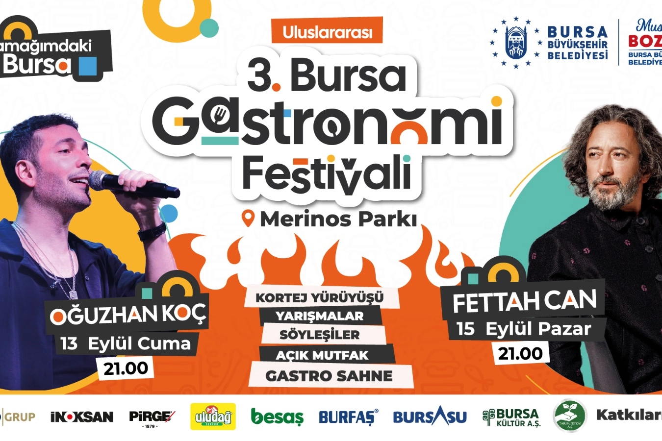 Bursa’nın sahip olduğu zengin mutfak kültürünü turizme kazandırmak ve dünyaya açmak amacıyla Büyükşehir Belediyesi tarafından ‘Damağımdaki Bursa’ temasıyla düzenlenecek olan 3. Gastronomi Festivali’ne 13-14-15 Eylül tarihlerinde Merinos Park ev sahipliği yapacak. Bu yıl uluslararası katılımla gerçekleşecek festival, konserler, yarışmalar, ünlü şeflerle söyleşiler gibi birbirinden renkli içerikleriyle Bursalılara unutulmaz bir deneyim yaşatacak. Bursa’nın duayen sanatçıları Müzeyyen Senar ve Zeki Müren’in isimlerinin verildiği çarşı alanlarında, ziyaretçiler hem göze hem de damaklara hitap eden tatları deneyimleme imkanı bulacak. İlk kez uluslararası katılım Bursa Üreten Kadınlar Sokağı’nda ise kadın dernekleri ve kooperatifleri kendi ürettikleri ürünleri sergileyecek. 7 farklı ülke ve 10 farklı şehirden katılımcıların da yer alacağı festivalde, 17 ilçe belediyesi de stantlarıyla yerini alacak. Karagöz ve Hacivat Atölyesi, farkındalık çadırının bulunacağı festivalde, ‘Bursa Lezzetleri ve Gastronomi Müzesi’ de kurularak katılımcılara görsel şölen yaşatılacak. Hazırlanan yarışma çadırında ise birbirinden renkli yarışmalar düzenlenecek. Ünlü sanatçılar ve şefler sahne alacak Damaklarda tat bırakacak olan festival, 13 Eylül Cuma günü Cumhuriyet Caddesi’nden başlayıp Atatürk Stadyumu Caddesi’ne kadar sürecek olan kortej yürüyüşüyle start alacak. Programlar yürüyüşün ardından Merinos Parkı’nda tüm hızıyla devam edecek. Ahilik geleneğinin anlatıldığı Şed törenin sahneleneceği festivalde, gün boyunca Şef gastro sahne ve söyleşiler düzenlenecek. Maria Ekmekçioğlu, Nebil Özgentürk, Şef Serkan Güzelçoban, Sahrap Soysal, Melek Baykal, Şef Yağız İzgül, Aslıhan Koruyan Sabancı, Pınar Altuğ Atacan gibi birbirinden ünlü isimler de Gastronomi Festivali’nde sahne alarak tecrübelerini Bursalılarla paylaşacak. Rekor denemesi, renkli yarışmalar Bilimsel oturumların ve atölyelerin yanında renkli yarışmaların da yapılacağı festivalde, gastronomi tutkunları birinci gelebilmek için kıyasıya yarışacak. Yarışma Çadırı’nda glutensiz süt helvası tadım yarışması, eşler yarışıyor, liseler yarışıyor, çocuk yemek yarışması, börek yeme yarışması, gelenekten geleceğe Bursa mutfağı yarışması, minik şefler yarışıyor gibi eğlenceli ve tatlı aktiviteler Bursalılara unutulmaz anlar yaşatacak. Açılışta Oğuzhan Koç, kapanışta Fettah Can Tavuk alma ritüeli gibi Bursa’ya özgü geleneklerin de sahneleneceği festivalde Bursalı sanatçılar Oğuzhan Koç ve Fettah can rüzgarı da esecek. Festivalin ilk gününde sahne olacak olan Oğuzhan Koç, Merinos Parkı’nı dolduracak sevenleri için sevilen şarkılarını seslendirecek. Festivalin kapanış programı ise ünlü sanatçı Fettah Can ile yapılacak. Dillerden düşmeyen şarkılarını Bursalılar için söyleyecek olan Fettah Can, katılanlara unutulmaz bir akşam yaşatacak.