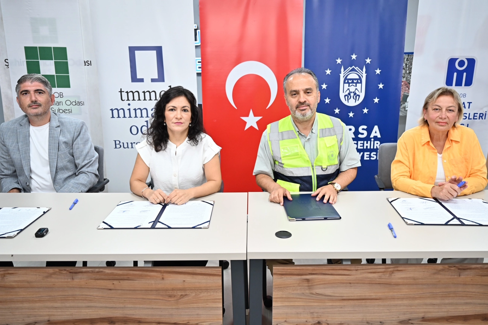 Konuşmaların ardından iş birliği protokolü Başkan Alinur Aktaş ile Mimar Odası Bursa Şube Başkanı Şirin Rodoplu, Şehir Plancıları Odası Bursa Şube Başkanı Murat İlkme ve İnşaat Mühendisleri Odası Bursa Şube Başkanı Ülkü Küçükkayalar arasında imzalandı.