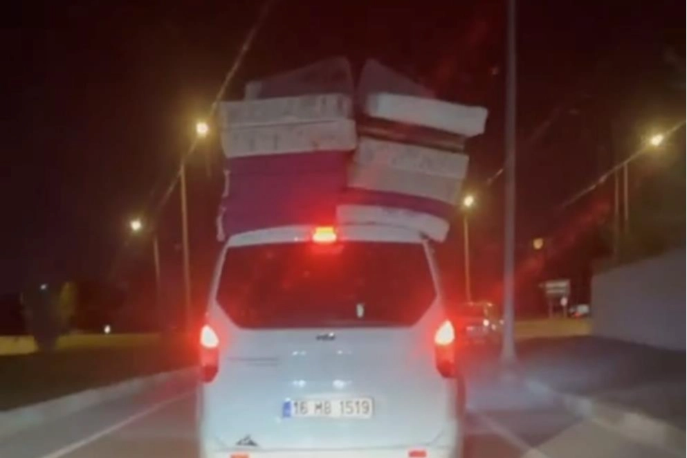 Bursa'nın İnegöl ilçesi İtfaiye Kavşağı’ndan İstiklal Caddesi'ne seyreden 16 MB 1519 plakalı hafif ticari aracın üzerine yüklenen yataklarla seyrettiğini gören sürücüler hayrete düştü. O anlar bir sürücü tarafından cep telefonu kamerası ile görüntülendi.