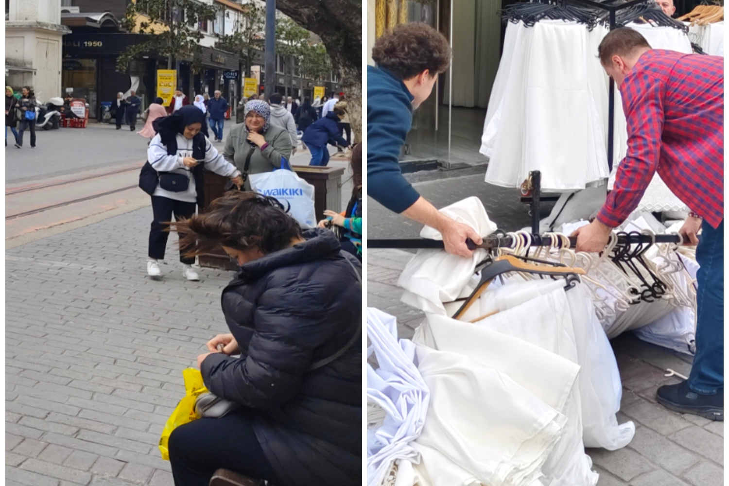 Kuvvetli rüzgarın etkisiyle ürünlerin zarar görmemesi için esnaf, hızla davranarak ürünleri yeniden toplayarak içeriye almak için uğraştı.