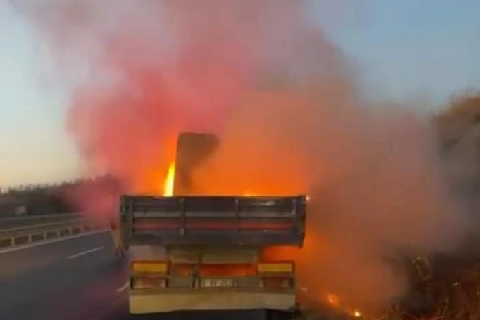 Sürücünün durumu fark etmesiyle araç hemen kenarı çekildi. Hızla büyüyen alevler tırdan anayoldaki otluk alana sıçradı. Sürücünün ihbarı üzerine olay yerine itfaiye ekibi sevk edildi. Alev topuna dönen tırı söndüren ekipler yol kenarında otluk alana sıçrayan alevleri de hızla söndürdü. Tırın alev alev yandığı anlar kameraya yansırken, yangında korkulan olmadı.
