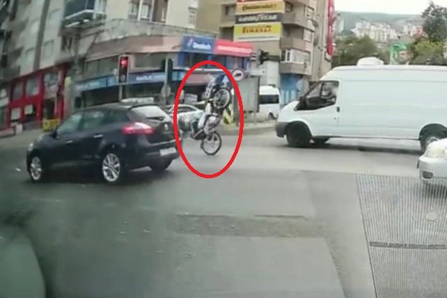 Merkez Osmangazi ilçesine bağlı Gazi Orhan Bey kavşağında ilerleyen motosiklet sürücüsü, önünde duran aracı son anda fark etti. Frene basan motosikletli otomobile çarpıp havaya savruldu. O anlar araç içi kamerasına yansırken, sürücü şans eseri kazayı ufak sıyrıklarla atlattı.
