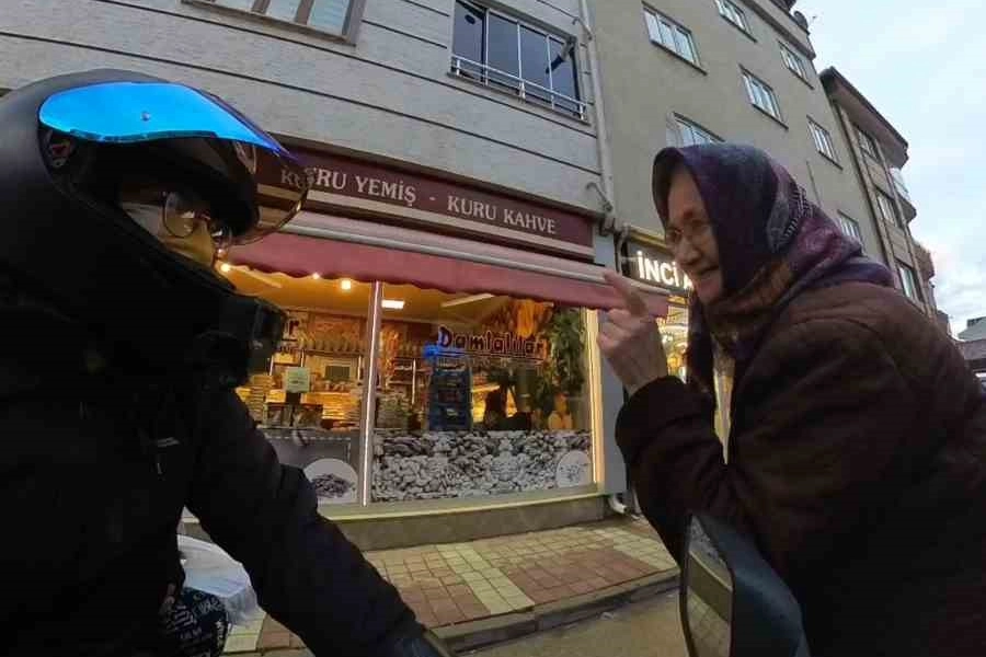 Olay İnegöl ilçesi Osmaniye Mahallesi Altay Caddesi üzerinde meydana geldi. Motosikletli gençler ilerlediği sırada önüne çıkan yaşlı kadına yol verdiler. "Ben size kurban olurum" diyen yaşlı kadına ise gençler, "Bende sana kurban olurum" cevabını verdi. Yaşlı kadın "Hayatta böyle sevgi görmedim ben sana daha çok kurban olurum. Benim yaşım gelmiş 70’e çarpsan ne olur. Ama bana çarpmazsan Allah seni insan yerine yazar" dedi. Yaşanan dikkat çeken diyalog, motosiklet üzerindeki aksiyon kamerasına saniye saniye yansıdı.