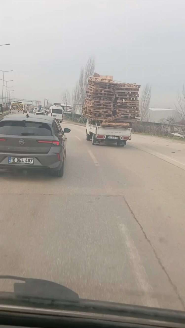 Olay, merkez Yıldırım ilçesi Şirinevler Mahallesi’nde meydana geldi. Edinilen bilgiye göre, kapasitesinin üstünde palet yüklü kamyonet, trafikte tehlike saçarak ilerledi. O anlar trafikteki diğer sürücülerin yüreklerini ağza getirirken, sürücü ara sokaklara girerek kendini kaybettirdi.