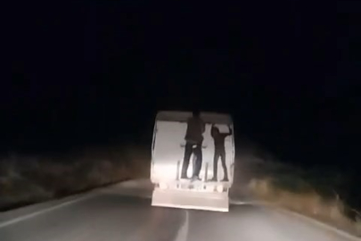 Bursa’da kamyonetin arkasında asılı giden baba ve oğlu, canlarını hiçe saydı. Arkadan gelen otomobil için de tehlike saçan 2 kişi, inişli çıkışlı virajlı yolda asılı bir şekilde ilerlemeye devam etti.