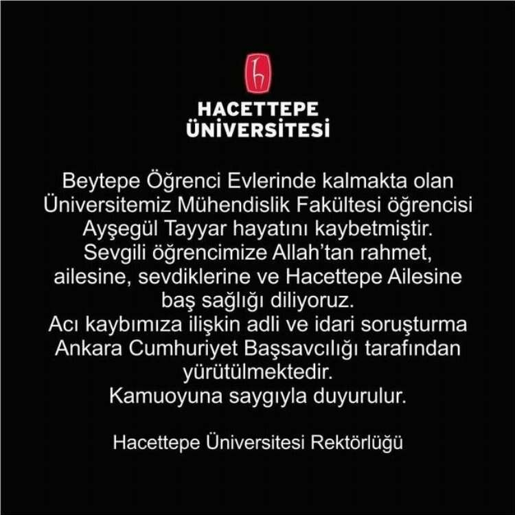 Olayın ardından Hacettepe Üniversitesinden yapılan açıklamada, "Beytepe Öğrenci Evlerinde kalmakta olan Üniversitemiz Mühendislik Fakültesi öğrencisi Ayşegül Tayyar hayatını kaybetmiştir. Sevgili öğrencimize Allah’tan rahmet, ailesine, sevdiklerine ve Hacettepe Ailesine başsağlığı diliyoruz. Acı kaybımıza ilişkin adli ve idari soruşturma Ankara Cumhuriyet Başsavcılığı tarafından yürütülmektedir” ifadelerine yer verildi.