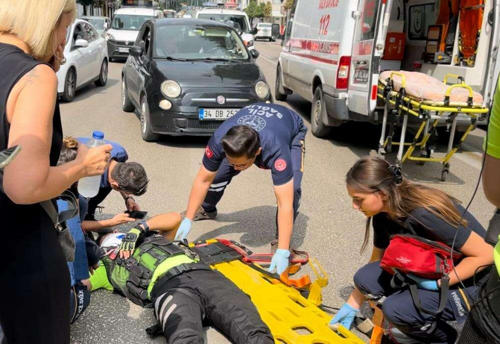 Bursa’da otomobiliyle seyir halindeki kadın sürücü dönüş yapmak isterken önünde motosikletle ilerleyen trafik polisine çarptı. Motosikletten düşen trafik polis memuru yaralanırken, kaza anı ise güvenlik kamerasına yansıdı.
