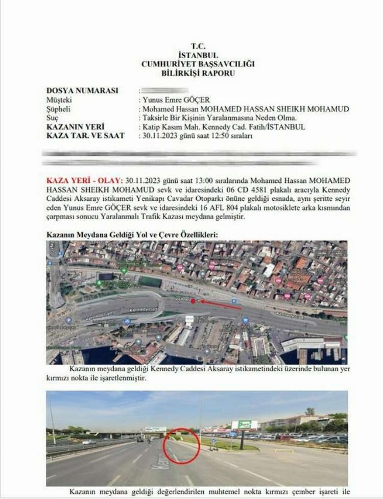 Cumhuriyet Başsavcılığı, kurye Göçer’in ölümünün ardından, polis kaza tutanağında Mohamud’un kusurlu olmadığını belirtmesine rağmen, yeni bir değerlendirme için dosyayı adli trafik bilirkişisine gönderdi. Bilirkişi raporu, Göçer’in kusursuz olduğunu, ancak Mohamud’un kusurlu olduğunu ortaya koydu. Bu raporun ardından savcılık, Mohamud hakkında “Taksirle ölüme neden olma” suçu kapsamında yakalama kararı talep etti.