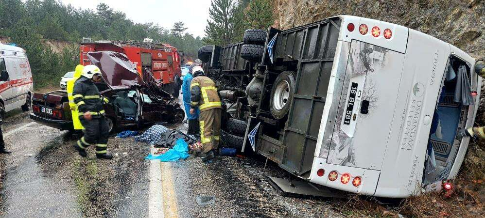 Yağışlı havanın etkisiyle meydana gelen kazada yolcuları taşıyan otobüs yan devrilirken, otomobil ikiye bölündü. İhbar üzerine bölgeye çok sayıda 112 Ekibi sevk edilirken, feci kazada otobüste bulunan Abdullah Öz (58) hayatını kaybetti, İbrahim Ç ,(59) Kadir S (28) ile Yusuf A. (27) yaralandı.