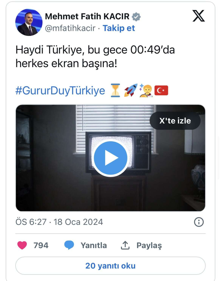 Bakan Kacır, "Gurur Duy Türkiye" etiketiyle yaptığı paylaşımda, "Haydi Türkiye, bu gece 00.49'da herkes ekran başına" ifadelerini kullandı.