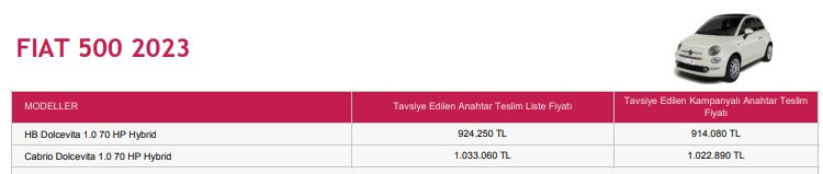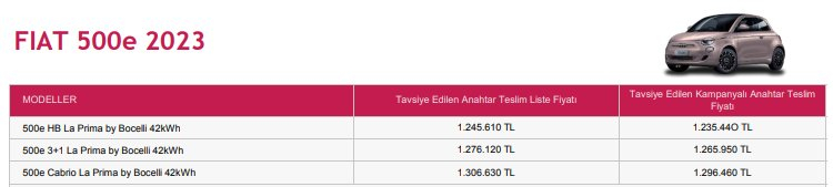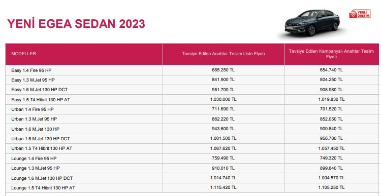 Tofaş Fiat'ın en uygun aracının Tavsiye Edilen Anahtar Teslim Liste Fiyatı Easy 1.4 Fire 95 HP'nin fiyatı 11 bin 350 TL artarak 673 bin 900 TL'den 685 bin 250 TL'ye yükseldi. Aynı aracın Tavsiye Edilen Kampanyalı Anahtar Teslim Fiyatı ise 643 bin 900 TL'den 654 bin 740 TL'ye yükseldi.