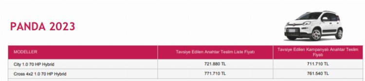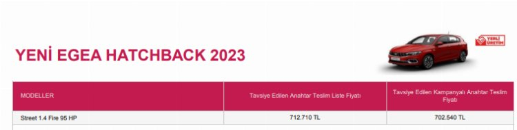 Tofaş Fiat'ın en uygun aracının Tavsiye Edilen Anahtar Teslim Liste Fiyatı Easy 1.4 Fire 95 HP'nin fiyatı 11 bin 350 TL artarak 673 bin 900 TL'den 685 bin 250 TL'ye yükseldi. Aynı aracın Tavsiye Edilen Kampanyalı Anahtar Teslim Fiyatı ise 643 bin 900TL'den 654 bin 740 TL'ye yükseldi.