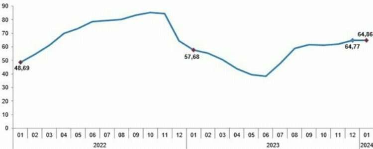 TÜFE ocak ayında yüzde 6,70 artarken, yıllık bazda yüzde 64,86'ya çıktı. Enflasyon böylece aylık bazda beş ayın zirvesine çıktı.