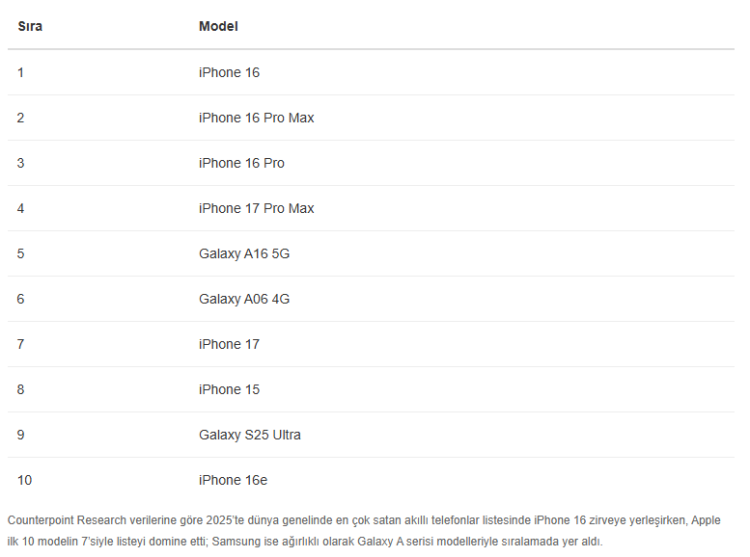 Liste genelinde Apple; iPhone 16 Pro Max, iPhone 16 Pro, iPhone 17 Pro Max, iPhone 17, iPhone 15 gibi modellerle üst sıraları paylaşırken, Samsung’un Galaxy A16 5G, Galaxy A06 4G ve Galaxy S25 Ultra gibi modelleri listenin diğer kısımlarında yer buldu.