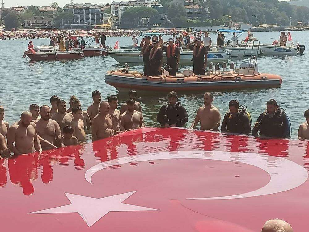 Kocaeli’nin Kandıra ilçesinde 30 Ağustos Zafer Bayramı'nda Deniz Yıldızları Spor Kulübü sporcuları denizde Türk bayrağı ve Atatürk posteri açtı.