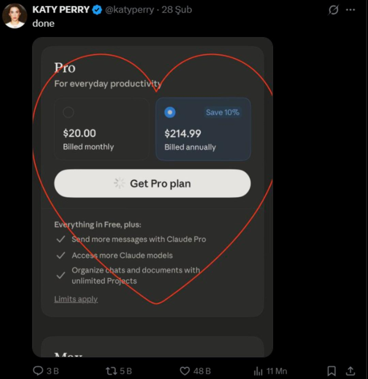OpenAI'ın yapay zeka modeli ChatGPT'ye aboneliklerini iptal eden birçok kullanıcı, Claude'a abone olduklarına ilişkin ekran görüntülerini sosyal medya hesaplarından paylaştı. ABD'li ünlü şarkıcı Katy Perry de bu kullanıcıların arasında yer aldı. Perry'nin Claude paylaşımı, 3 milyon görüntülemeye ulaştı.