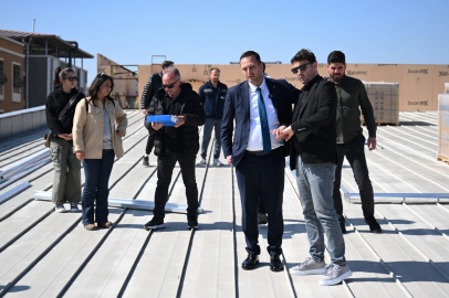 İZMİR (İGFA) - Yaşar Üniversitesi ve Avrupa Enerji Kentleri Ağı ortaklığıyla yürütülen STORMLOG Projesi kapsamında, İklim Değişikliğine Uyum Hibe Programı desteğiyle Çamdibi Dr. Şaban Acarbay Kapalı Yüzme Havuzu’nun çatısına güneş enerjisi panelleri yerleştirilmeye başlandı. Bornova Belediye Başkanı Ömer Eşki, çalışmaları ilgili bürokratlarla birlikte yerinde inceledi.
