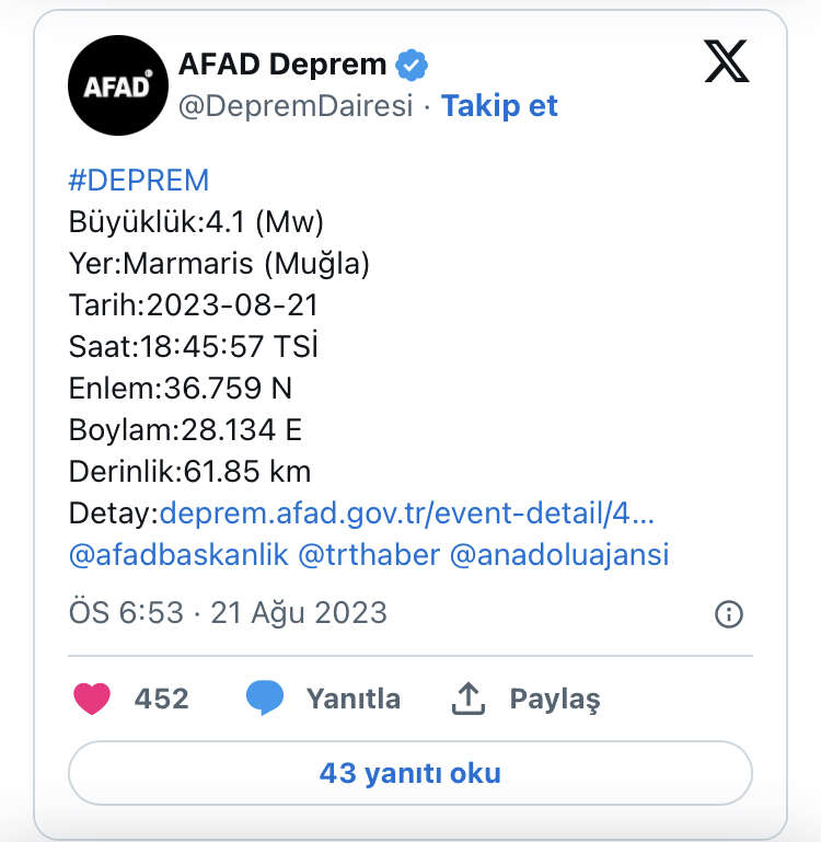 AFAD, Muğla'nın Marmaris ilçesinde saat 18.45'te 4,1 büyüklüğünde deprem meydana geldiğini duyurdu. Sarsıntı İzmir ile çevre il ve ilçelerden de hissedildi.
