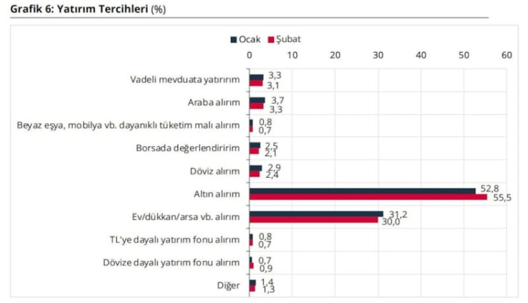 TCMB'nin ilk kez yayımladığı şubat ayı anketine göre hane halkının gelecek 12 ay için yatırım tercihleri; altın, gayrimenkul, araba, vadeli mevduat ve döviz olarak belirlendi.