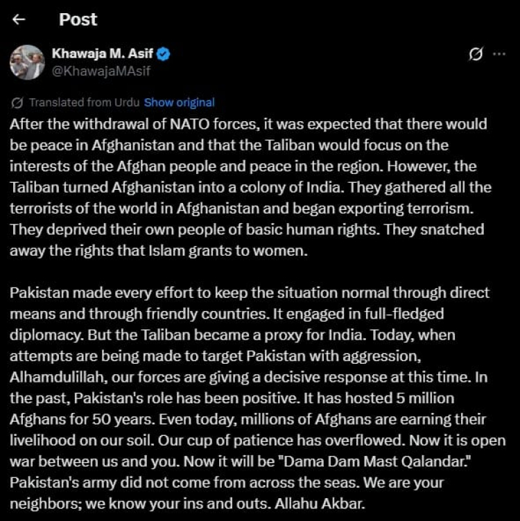 Pakistan Savunma Bakanı Khavaja Muhammed Asıf, Afganistan ile “açık savaş içinde" olduğunu ilan etti. İslamabad yönetiminin sabrının tükendiğini ifade eden Asıf, Pakistan'ın durumu "normal tutmak" için diplomasi yürüttüğünü ancak Taliban'ın Afganistan'ı Hindistan'ın bir kolonisi haline getirdiğini söyledi.