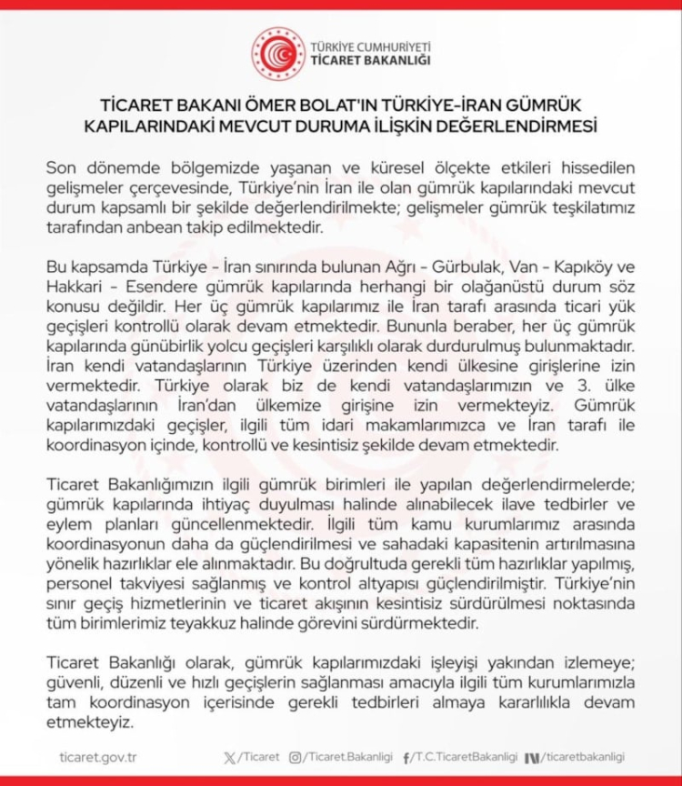 "Son dönemde bölgemizde yaşanan ve küresel ölçekte etkileri hissedilen gelişmeler çerçevesinde, Türkiye’nin İran ile olan gümrük kapılarındaki mevcut durum kapsamlı bir şekilde değerlendirilmekte; gelişmeler gümrük teşkilatımız tarafından anbean takip edilmektedir.