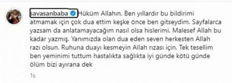 Hüküm Allahın. Ben yıllardır bu bildirimi atmamak için çok dua ettim keşke önce ben gitseydim. Sayfalarca yazsam da anlatamayacağım nasıl olsa hislerimi. Malesef Allah bu kadar yazmış. Yanımızda olan dua eden seven herkesten Allah razı olsun. Ruhuna duayı kesmeyin Allah rızası için. Tek tesellim ben yeminimi tuttum hastalıkta sağlıkta iyi günde kötü günde ölüm bizi ayırana dek.