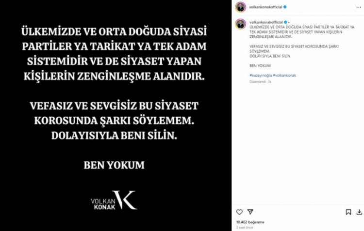 Karadeniz müziğinin başarılı sanatçılarından Volkan Konak, yaptığı açıklamada "Vefasız ve sevgisiz bu siyaset korosunda şarkı söylemem. Ben yokum" diyerek resti çekti. Müziği bıraktığı düşünülen şarkıcı, sözleriyle kafa karıştırdı.