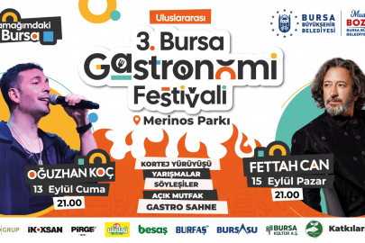 Bursa’nın sahip olduğu zengin mutfak kültürünü turizme kazandırmak ve dünyaya açmak amacıyla Büyükşehir Belediyesi tarafından ‘Damağımdaki Bursa’ temasıyla düzenlenecek olan 3. Gastronomi Festivali’ne 13-14-15 Eylül tarihlerinde Merinos Park ev sahipliği yapacak. Bu yıl uluslararası katılımla gerçekleşecek festival, konserler, yarışmalar, ünlü şeflerle söyleşiler gibi birbirinden renkli içerikleriyle Bursalılara unutulmaz bir deneyim yaşatacak. Bursa’nın duayen sanatçıları Müzeyyen Senar ve Zeki Müren’in isimlerinin verildiği çarşı alanlarında, ziyaretçiler hem göze hem de damaklara hitap eden tatları deneyimleme imkanı bulacak.