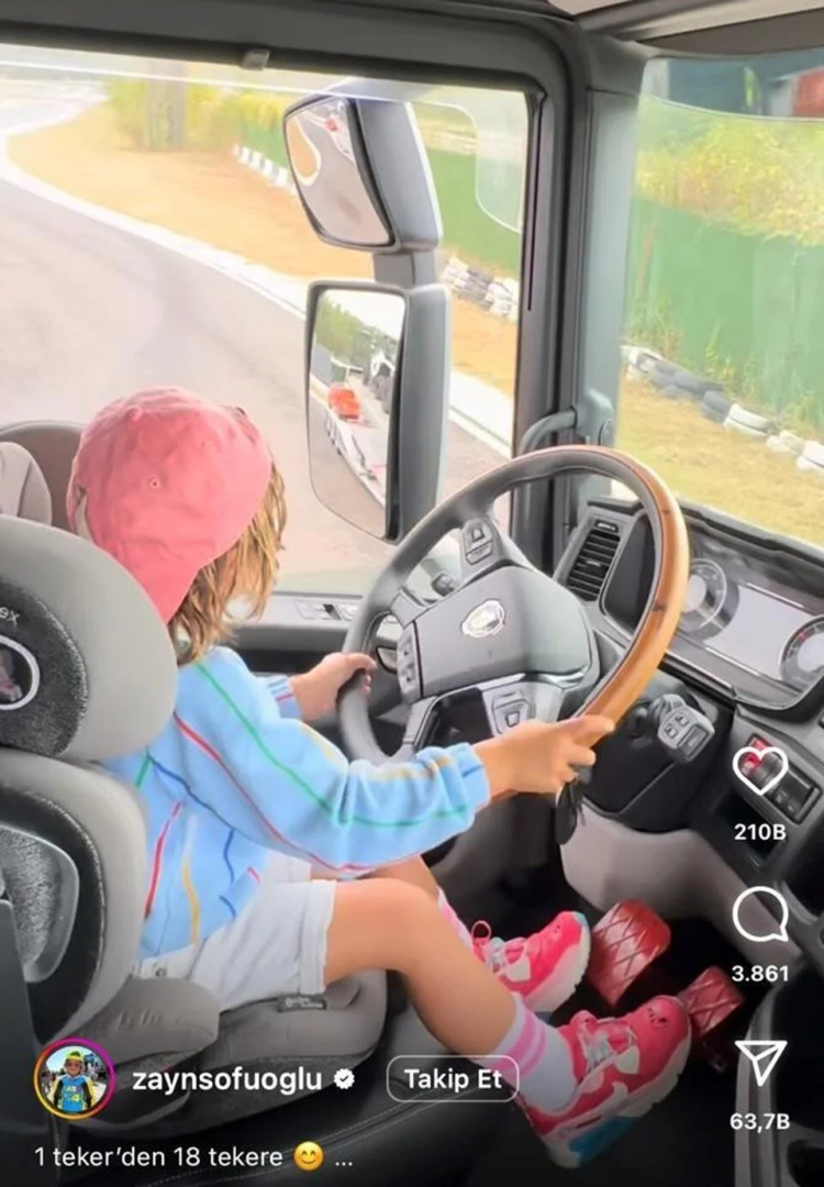 Daha önce araba ve motor sürerken görüntüleri sosyal medyada yer alan Kenan Sofuoğlu’nun 4 yaşındaki oğlu Zayn Sofuoğlu, bu defa tır kullandı.