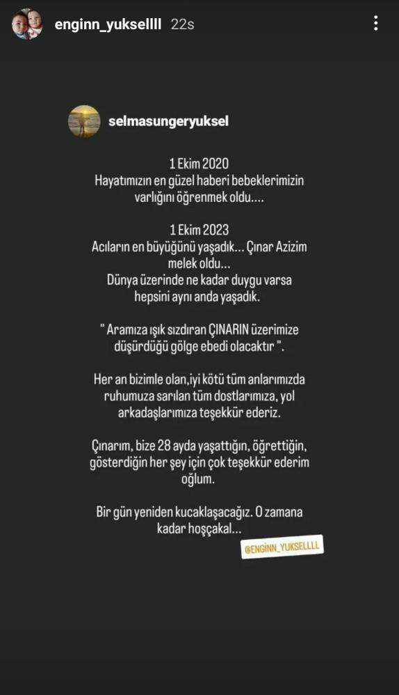 Engin Yüksel'in eşi Selma Sünger Yüksel ise evlat acısını takipçileriyle paylaşarak, "1 Ekim 2020. Hayatımızın en güzel haberi bebeklerimizin varlığını öğrenmek oldu. 1 Ekim 2023 acıların en büyüğünü yaşadık. Çınar Aziz'im melek oldu. Dünya üzerinde ne kadar duygu varsa hepsini aynı anda yaşadık. Aramıza ışık sızdıran Çınar'ın üzerimize düşürdüğü gölge ebedi olacaktır. Her an bizimle olan, iyi kötü tüm anlarımızda ruhumuza sarılan tüm dostlarımıza, yol arkadaşlarımıza teşekkür ederiz. Çınar'ım, bize 28 ayda yaşattığın, öğrettiğin, gösterdiğin her şey için çok teşekkür ederim oğlum. Bir gün yeniden kucaklaşacağız. O zamana kadar hoşça kal" dedi.