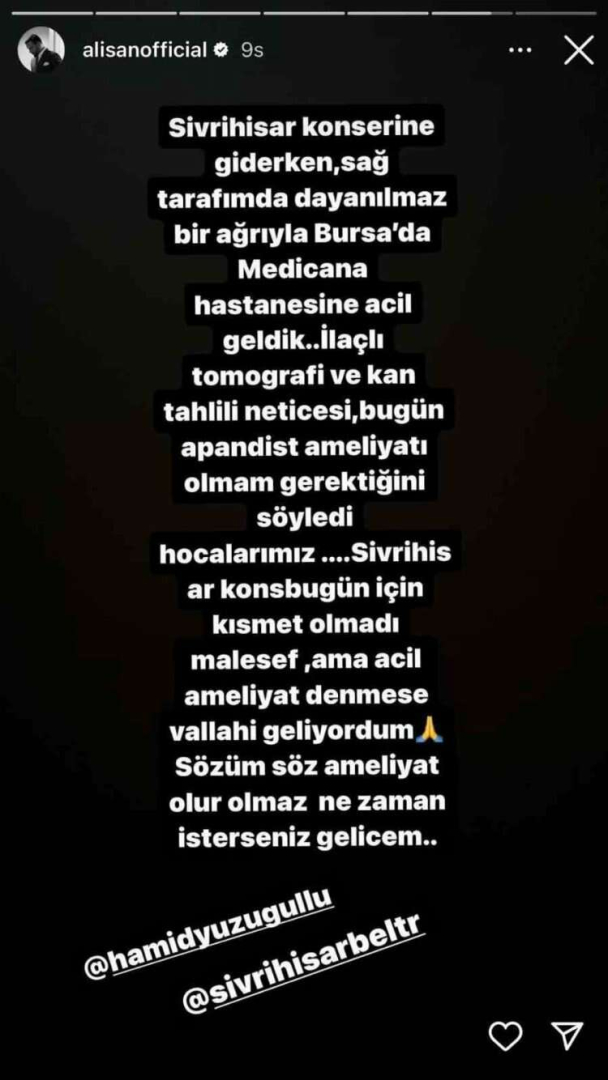 Alişan, sosyal medya hesabından yaptığı açıklamada, “Sivrihisar konserine giderken sağ tarafımda dayanılmaz bir ağrıyla Bursa’da acile geldik. İlaçlı tomografi ve kan tahlili neticesi bugün apandisit ameliyatı olmam gerektiğini söyledi hocalarımız. Sivrihisar konseri bugün için kısmet olmadı maalesef. Acil ameliyat denmese vallahi geliyordum. Sözüm söz, ameliyat olur olmaz ne zaman isterseniz geleceğim" dedi.