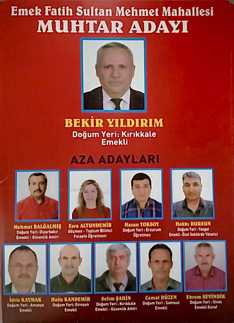 Dikmen köyünden gelen Bekir Yıldırım, Bursa Emek Fatih Sultan Mehmet Mahallesi'nde muhtar adayı oldu. Gazeteci ve yazarlık geçmişi olan Yıldırım, emekli olduktan sonra mahalle sorunlarına odaklandı. Mahalle sakinlerine hizmet etmeyi amaçlayan Yıldırım, uzun yıllardır mahallesinde ikamet ediyor.
