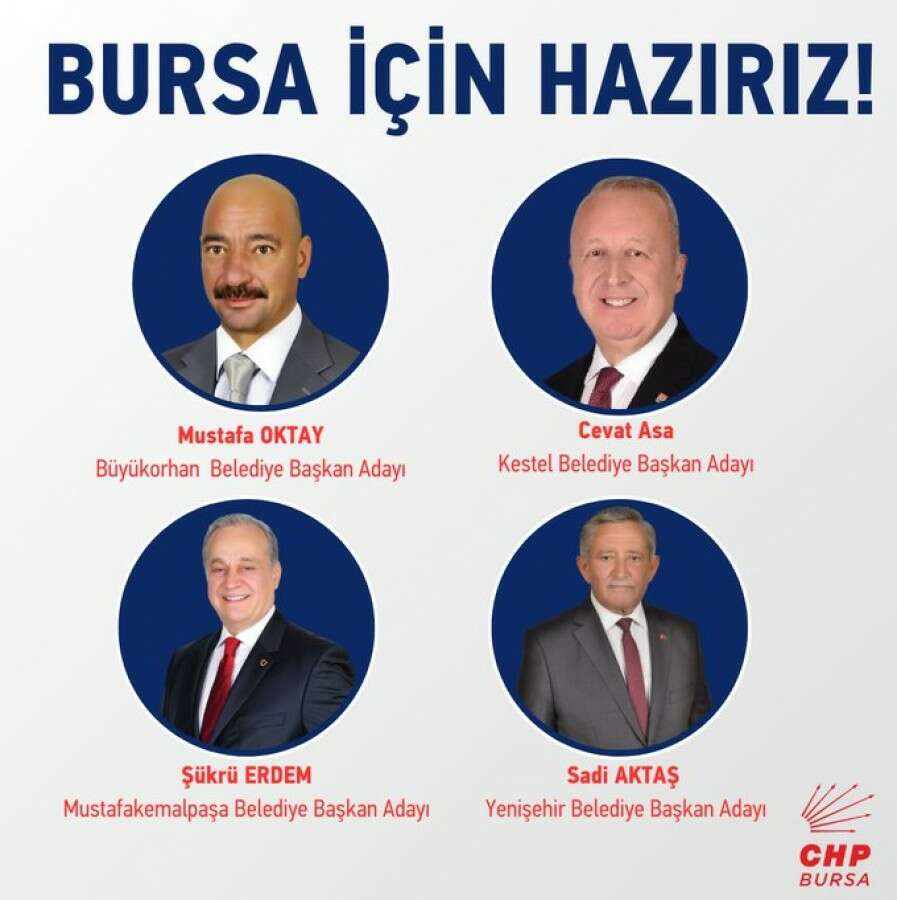 Cumhuriyet Halk Partisi (CHP) yönetimi, Bursa'da gerçekleştirilecek olan yerel seçimlere ilişkin olarak 4 ilçenin Belediye Başkan Adaylarını belirlediğini duyurdu.