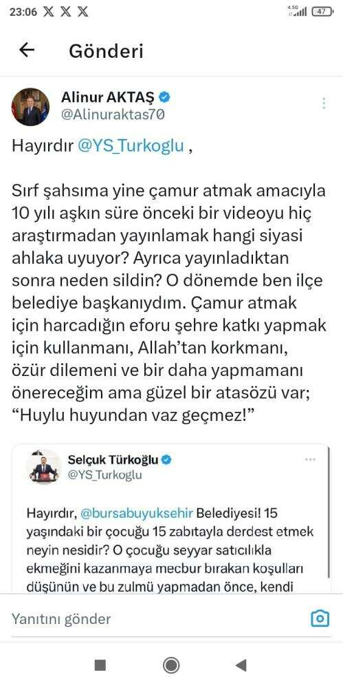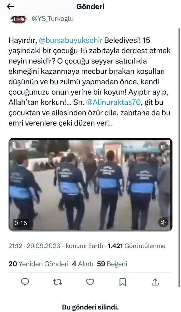 Geçmiş yıllarda seyyar satıcı bir çocuğun zabıta memurları tarafından uzaklaştırıldığı videonun altına, "Hayırdır @bursabüyükşehir Belediyesi! 15 yaşındaki bir çocuğu 15 zabıta memuruyla derdest etmek neyin nesidir? O çocuğu seyyar satıcılıkla ekmeğini kazanmaya mecbur bırakan şartları düşünün ve bu zulmü yapmadan önce kendi çocuğunuzu onun yerine bir koyun! Ayıptır ayıp, Allah'tan korkun!... Sn.@Alinuraktaş70, git bu çocuktan ve ailesinden özür dile, zabıtana da bu emri verenlere çeki düzen ver" şeklinde yorum yapıp sosyal medya hesaplarından paylaştı.