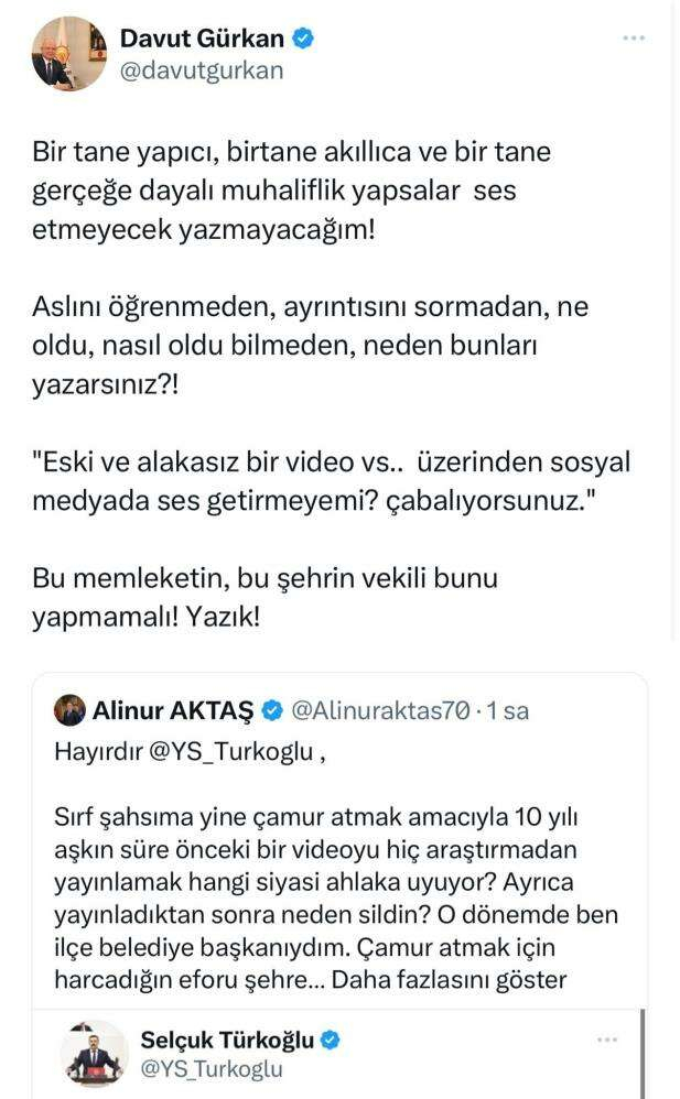 İşte Aktaş'ın İYİ Partili vekile verdiği cevap: "Hayırdır @YS_Türkoğlu, sırf şahsıma yine çamur atmak amacıyla 10 yılı aşkın süre önceki bir videoyu hiç araştırmadan yayınlamak hangi siyasi ahlaka uyuyor? O dönemde ben ilçe belediye başkanıydım. Çamur atmak için harcadığın eforu şehre katkı yapmak için kullanmanı, Allah'tan korkmanı, özür dilemeni ve bir daha yapmamanı önereceğim ama güzel bir atasözü var; "Huylu huyundan vazgeçmez!"