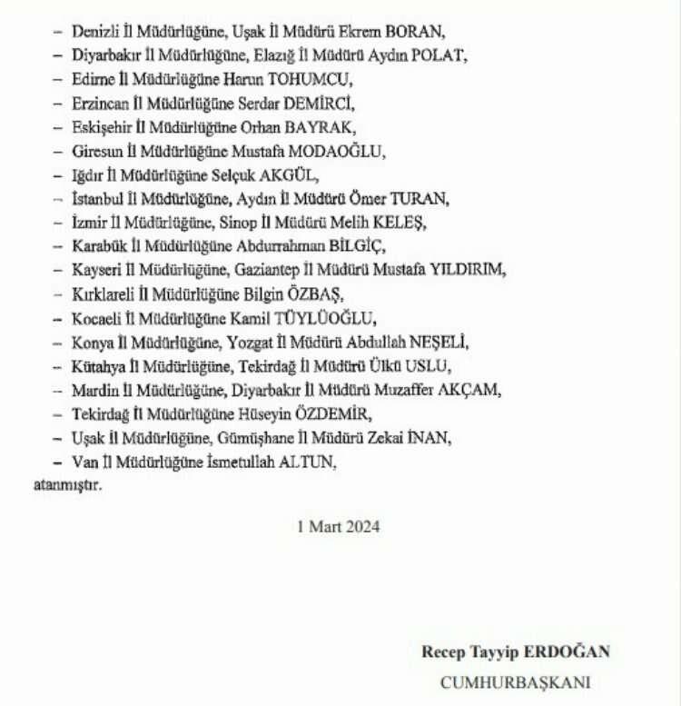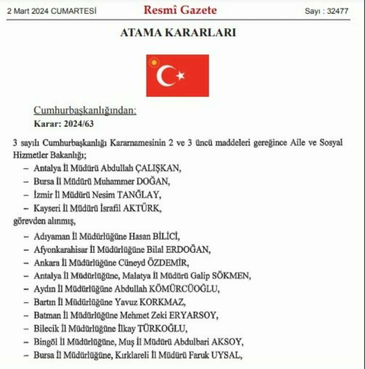 Cumhurbaşkanı Recep Tayyip Erdoğan tarafından imzalanan ve Resmi Gazete’de yayımlanan atama kararlarına göre, Aile Sosyal Hizmetler Bakanlığı’na bağlı Bursa İl Müdürü değişikliğe uğradı. Bu kararlar kapsamında bir dizi il müdürlüğünde görev değişiklikleri gerçekleştirildi. Aile Sosyal Hizmetler Bakanlığı’na bağlı Bursa İl Müdürü Muhammer Doğan görevden alınarak yerine Kırklareli İl Müdürü Faruk Uysal atanmıştır.