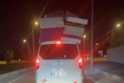 Bursa'nın İnegöl ilçesinde aracının üzerinde yatak taşıyan sürücünün tehlikeli yolculuğu kameraya yansıdı.
