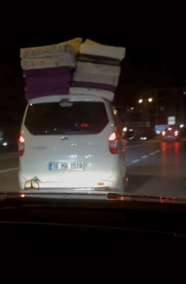 Bursa'nın İnegöl ilçesi İtfaiye Kavşağı’ndan İstiklal Caddesi'ne seyreden 16 MB 1519 plakalı hafif ticari aracın üzerine yüklenen yataklarla seyrettiğini gören sürücüler hayrete düştü. O anlar bir sürücü tarafından cep telefonu kamerası ile görüntülendi.