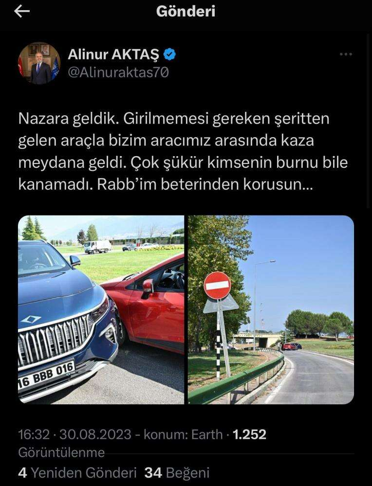 Bursa Büyükşehir Belediye Başkanı Alinur Aktaş’ın Sanayi ve Teknoloji eski Bakanı Mustafa Varank tarafından hediye edilen TOGG marka aracı kazaya karıştı. Kazada kimsenin burnu bile kanamazken, Bursa Büyükşehir Belediye Başkanı Alinur Aktaş kazayı sosyal medya hesaplarından paylaştı. Paylaşımda “Nazara geldik. Girilmemesi gereken şeritten gelen araçla bizim aracımız arasında kaza meydana geldi. Çok şükür kimsenin burnu bile kanamadı. Rab'bim beterinden korusun” ifadelerine yer verdi.