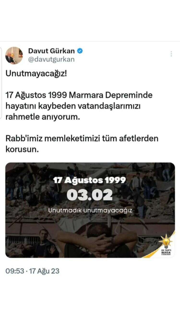 AK Parti Bursa İl Başkanı Davut Gürkan 17 Ağustos 1999 depreminin 24. yılında sosyal medya hesabından yaptığı paylaşımla depremde hayatlarını kaybedenlere rahmet dileyerek andı.