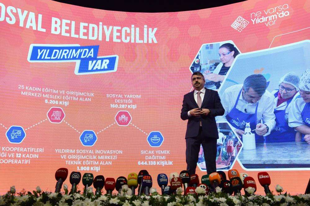 Yıldırım Belediye Başkanı Oktay Yılmaz, 11 kentsel dönüşüm projesinin sürdüğünü, tapu sorununu çözdükleri kişi sayısının 40 bine ulaşacağını belirterek, “Bugün uyumayan kütüphane sayısını 5’e çıkarıyoruz. 50 bin genç kütüphanelerimizin üyesi. 48 bin kadın ise spor merkezlerimizden istifade ediyor. 600 bin metrekare olarak hedeflediğimiz yeni yeşil alan hedefini mart ayında 1,5 milyon metrekare olarak gerçekleştireceğiz” dedi. Yeni dönemde doğal aday olduğuna işaret eden Oktay Yılmaz, “Yıldırımın geleceği için bundan sonra da çalışmaya devam edeceğiz. Ne varsa Yıldırım’da var. Yıldırım’ın geleceği için biz varız diyoruz” ifadelerini kullandı.