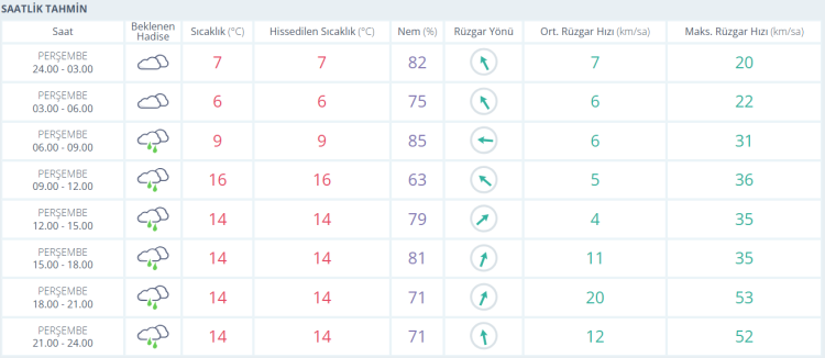 Saatlik tahminler de özellikle sabahın erken saatleri ile öğle sonrası arasında yağışın etkisini göstereceğine işaret ediyor. Öğle saatlerinde sıcaklık 16 dereceye kadar çıkarken, hissedilen sıcaklık da aynı seviyelerde olacak. Akşam saatlerine doğru sıcaklık 14 derece civarında dengelenirken, rüzgarın hamleli olarak zaman zaman 50 kilometreyi aşabileceği tahmin ediliyor.