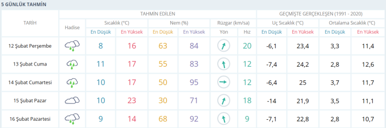 Bursa’da beş günlük tahmine bakıldığında ise yağışlı hava cuma ve cumartesi günleri de etkisini sürdürecek. Cuma günü en düşük sıcaklık 11, en yüksek sıcaklık 17 derece; cumartesi günü ise 10 ila 17 derece arasında değişecek. Bu iki günde de aralıklı yağmur bekleniyor ve nem oranının yüksek seyretmesi öngörülüyor.